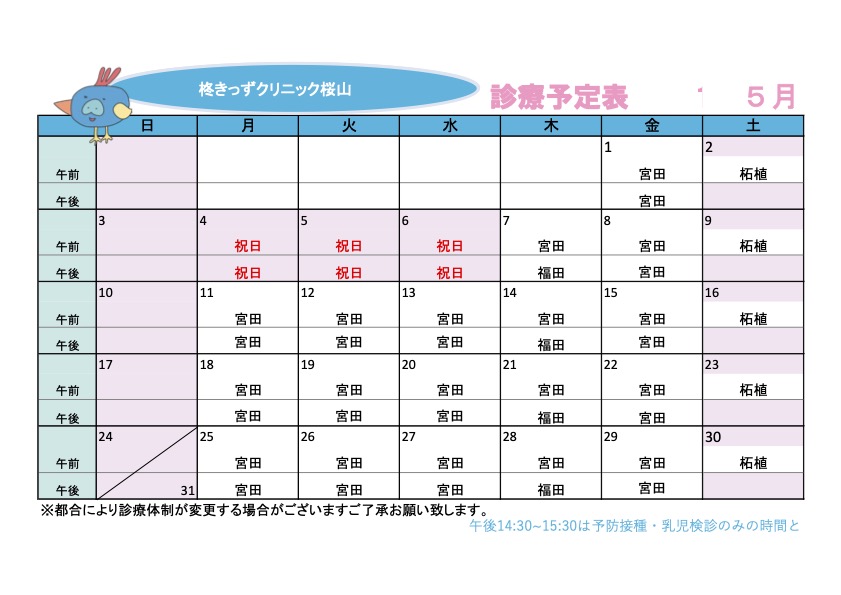 ※4月30日(木)14:30〜15:30の予防接種・乳児検診の時間帯は福田医師の都合のため休診となります。午後の診察は通常通り福田医師が行います。